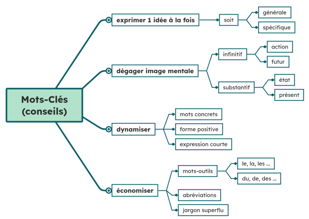 Les mots-clés sont en quelque sorte la résurrection du style rédactionnel des télégrammes d’antan, lorsque le tarif et la capacité du média obligeaient à économiser les mots. De la même manière, dans une carte mentale, chaque mot compte.